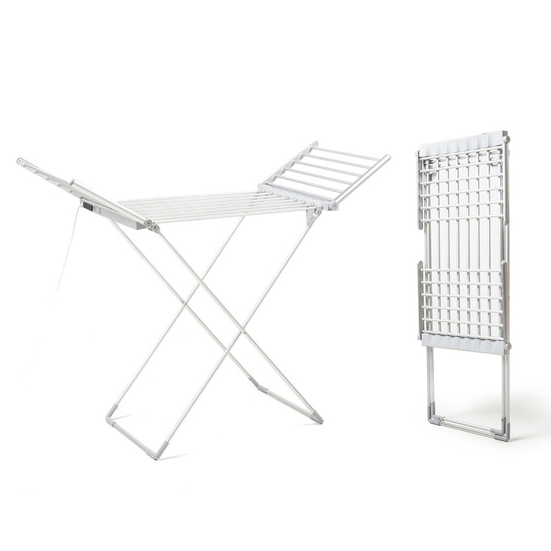 Foldable, electric design: our foldable electric drying rack is lightweight, durable, and safe. Its aluminum frame and crossed X-shape provide greater stability and support.It folds easily, taking up minimal space when stored. Can be placed behind doors, in closets, etc.