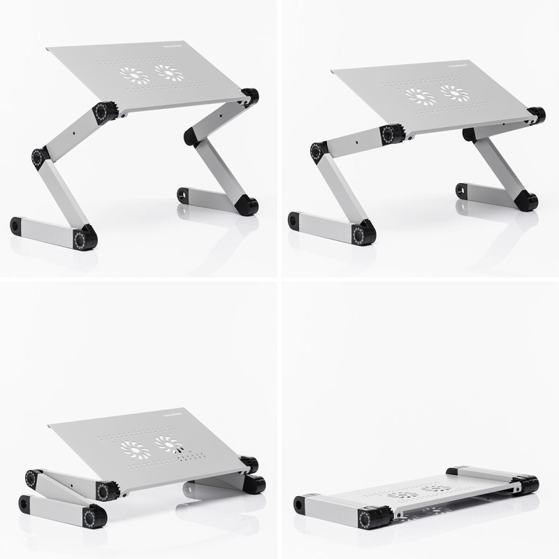 An adjustable multipurpose table, ideal for working on a laptop. It is also very useful for eating on, as a music stand, etc. Thanks to its great versatility and adaptable folding design, it can be used in different positions: on a chair or on the floor, lying down or seated, standing up on a stable surface, etc. It has a separate tray for a mouse and two legs jointed at 3 points with a rotaion of up to 360º, which allows adjustment of its height and lean so that if can offer an infinite number of possibilities to fully adapt it to your needs at any moment. The perforated aluminium support base enhances ventilation and reduces overheating. In addition, it includes a manual with recommended positions for different purposes.