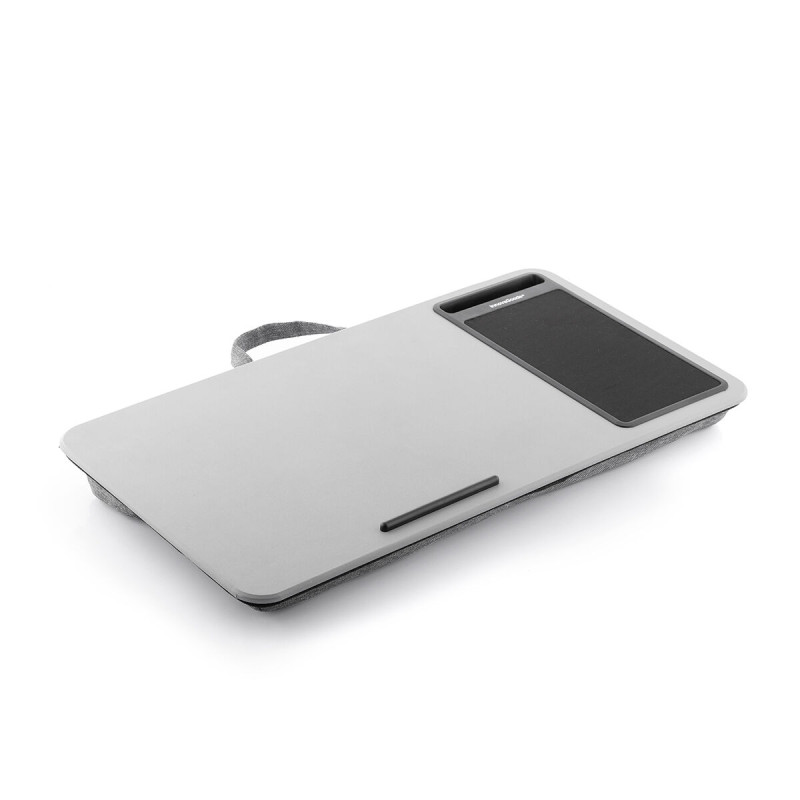 A portable laptop desk with comfortable integrated cushion on the base for support so you can work in total comfort. The rigid top tray provides a large work space and firm and stable hold. It also has a mouse mat and a holding groove for smartphone. The padded base has two cushions of different sizes to provide an optimum angle when placed on your lap. This original desk has an ergonomic, modern and elegant design. It is also compact and lightweight so it can be taken anywhere with its carry handle and stored easily. Thanks to its versatility and adaptability, it has a variety of uses (working on the computer, writing, drawing, reading, eating, etc.) in different places (bed, sofa, armchair, etc.). It has been made using quality materials so it is robust and durable. It helps to keep things tidy and make the most of the space available.