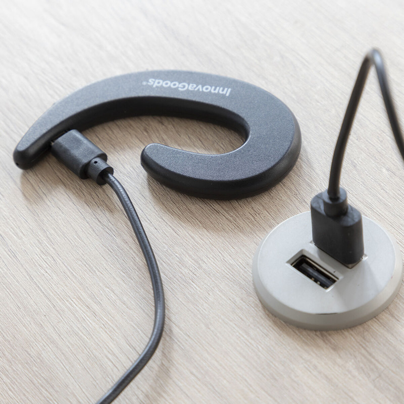 An open ear headphone for one ear which plays the sound near the ear without obstructing it, enabling you to also hear the surrounding ambient sound. Thanks to its ergonomic open ear design, it fits the ear perfectly and is very comfortable and easy to use, without rubbing or causing any annoyance. Its hook shape provides a secure and safe fit. This modern wireless and rechargeable headphone is compact, ultra lightweight and easy to transport and store. The silicone adapter included concentrates the sound, increasing its volume and quality when desired. It features Bluetooth 4.1 with a reach of up to 10m. Ideal for listening to music anywhere or answering phone calls in total comfort thanks to its inbuilt microphone and hands free function. Includes of USB to micro USB charging cable.