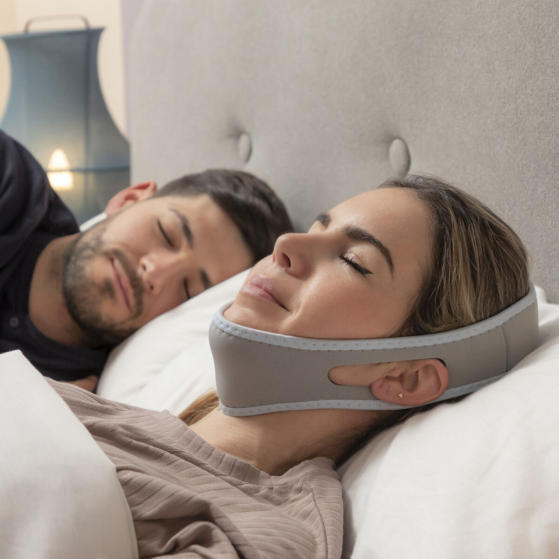 A highly effective anti-snoring band to help prevent snoring, stopping you from disturbing other people at night and enabling an improved quality of sleep. Thanks to its ergonomic unisex design, it can be used by both men and women. A simple and natural solution to help you to fall asleep and improve rest by preventing annoying snoring when asleep, as it helps you to breathe gently and normally. This universal anti-snoring band keeps the jaw in the correct position, keeping the mouth closed and favouring breathing through the nose. It has holes for the ears and a padded interior in the chin area for greater comfort. It has a Velcro closure which is adjustable and provides a firm hold. Its elasticated and adaptable fabric is breathable and soft to touch, so it doesn’t rub or damage the skin. It can be cleaned easily by hand washing.
